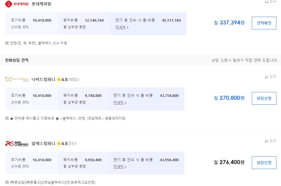 2024년형 카니발 가솔린 3.5(9인승) 프레스티지 (a/t) 장기렌트 이용기간 36개월, 선납금 30% 기준의 카니발 장기렌트 가격 입니다. 카니발 장기렌트 가격 차이가 월 비용 최대 6만원 정도 차이가 나기 때문에 업체별로 옵션과 가격 꼼꼼히 따져보고 결정하시길 바랍니다.