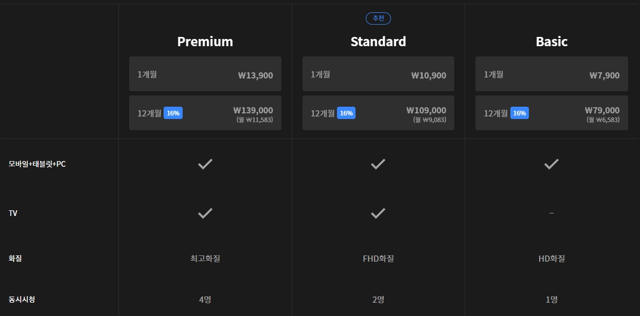 프리미엄 요금제와 스탠다드, 베이직 요금제의 차이는 동시시청, 화질, 시청 가능 디바이스가 있겠습니다. 프리미엄의 경우 모든 모바일, 태블릿, pc, tv에서 최고화질로 볼수 있으며 동시시청은 4명까지 됩니다. 스탠다드 요금제도 모든 디바이스에서 시청할 수 있으며 화질은 FHD화질, 동시시청 인원은 2명 입니다. 배이직 요금제는 가장 저렴한 요금제로 모바일, 태블릿, PC에서 시청이 가능하지만 티비에서는 볼 수 없으며 화질은 HD화질, 동시시청 인원은 1명 입니다.