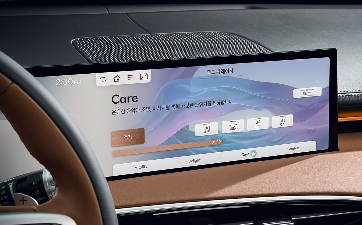 27인치 OLED 통합형 와이드 디스플레이 파노라믹 디스플레이: 클러스터와 인포테인먼트 시스템이 하나의 파노라믹 디스플레이로 합쳐져 미래지향적이고 고급스러운 분위기를 연출합니다.