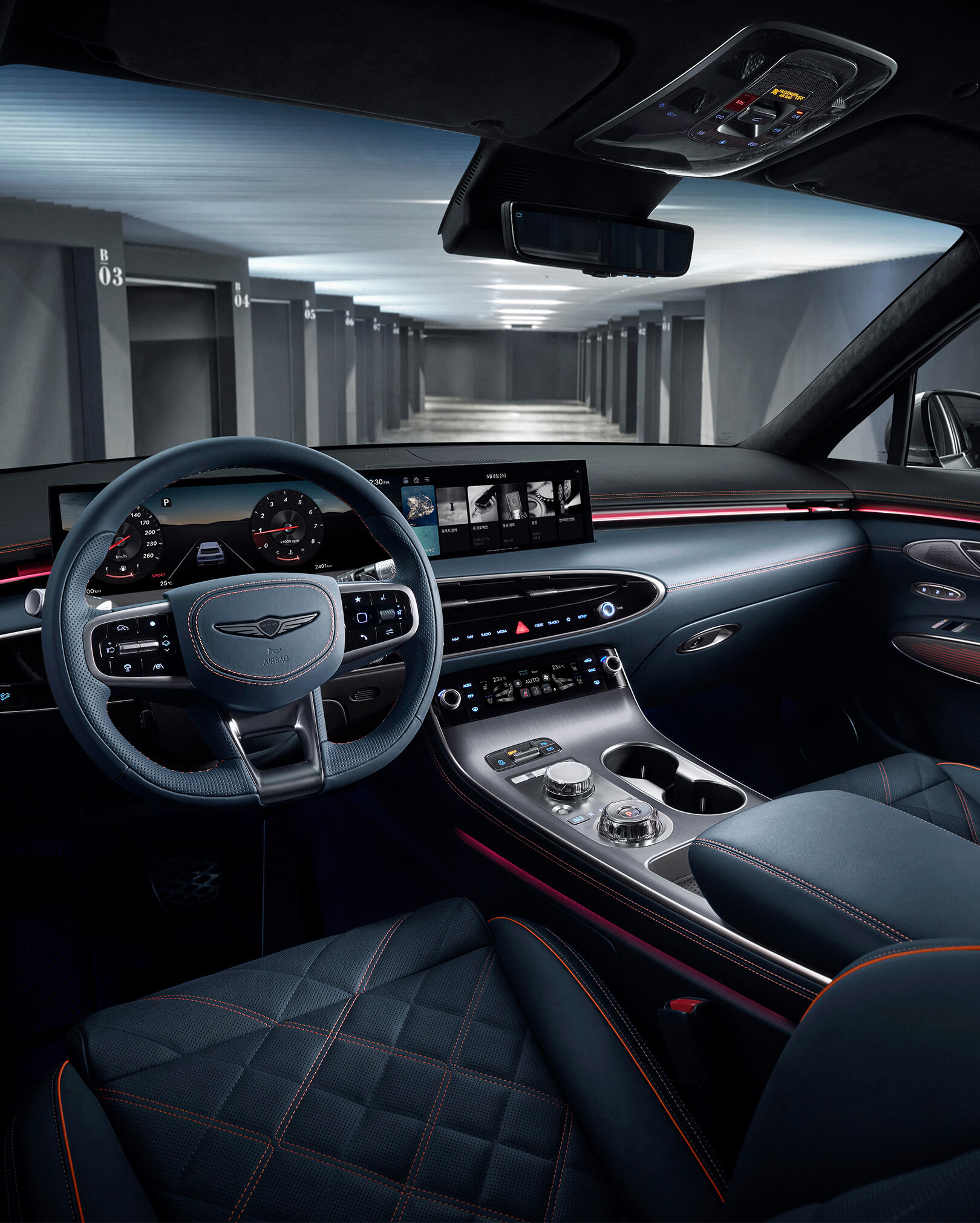 스포츠 패키지: D-컷 스티어링 휠과 프라임 나파 가죽 시트는 다이내믹한 드라이빙 성능을 시각화하며, 스포티 라인 무드 라이팅은 속도감이 느껴지는 그래픽 패턴과 다양한 컬러의 조명으로 스포티한 주행 느낌을 고조시킵니다.