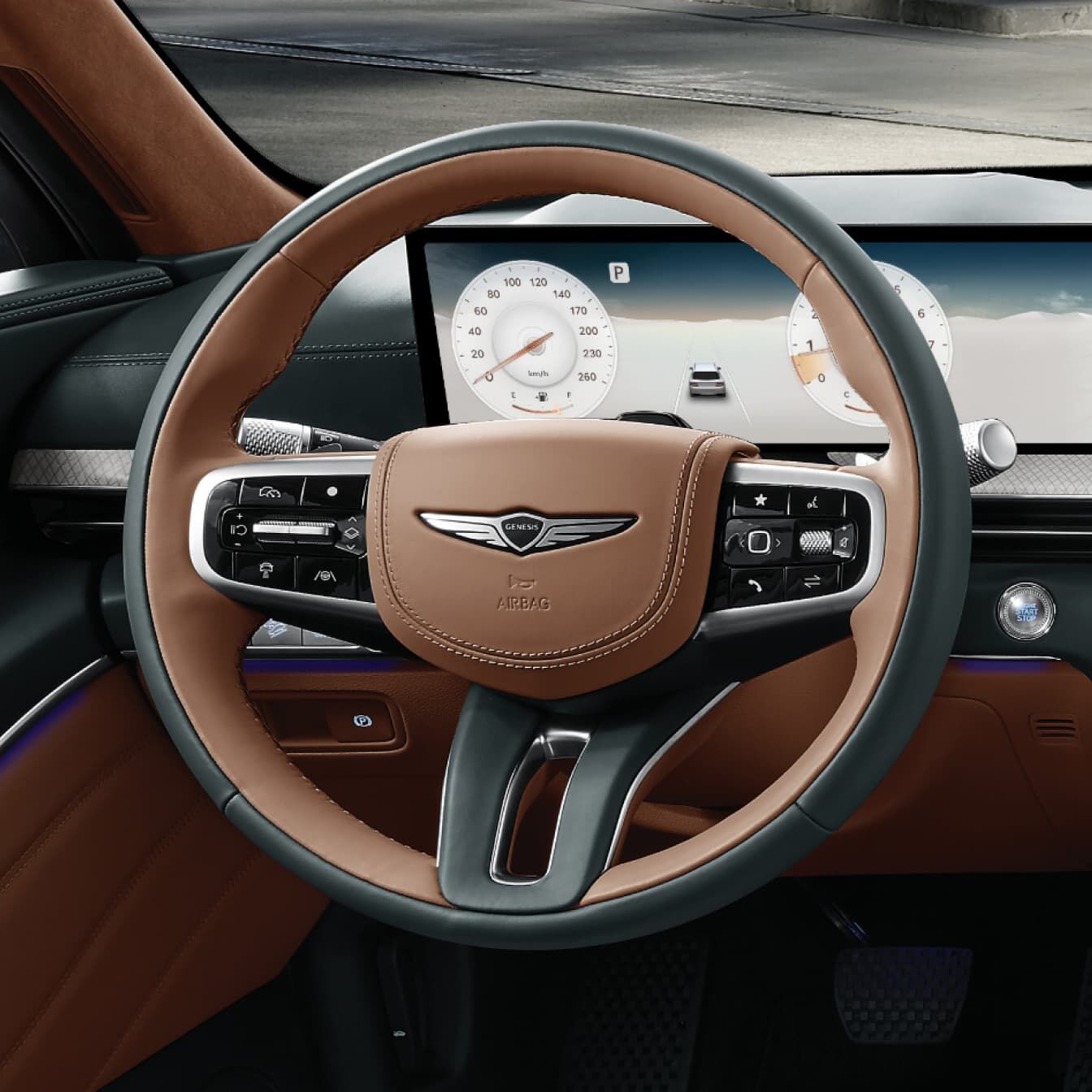 - 투톤 가죽 스티어링 휠: 인테리어 컬러와 매칭된 투톤 디자인으로 고급스러움을 더하며, 제네시스 신규 엠블럼이 적용되었습니다.