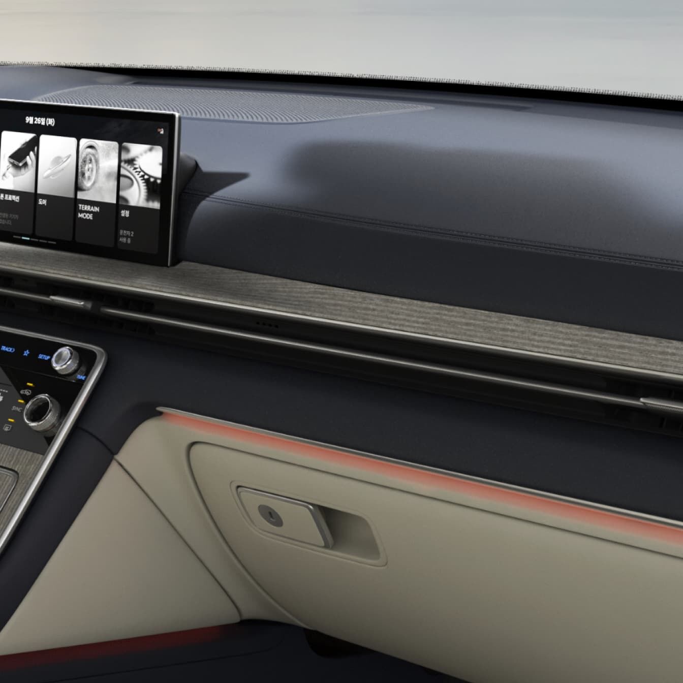 - 27인치 OLED 통합 디스플레이: 계기판과 내비게이션 화면을 하나의 파노라믹 디스플레이로 연결하여 하이테크한 실내 이미지를 강조합니다.