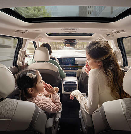 넓고 편안한 인테리어: 최대 여섯 명이 탑승 가능하며, 두 번째 및 세 번째 열 좌석은 폴딩 가능하여 다양한 적재 용량을 제공합니다.